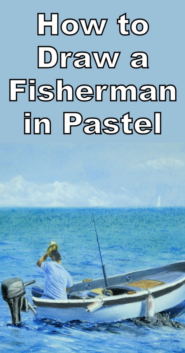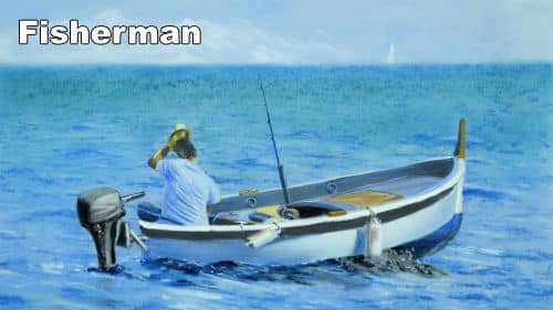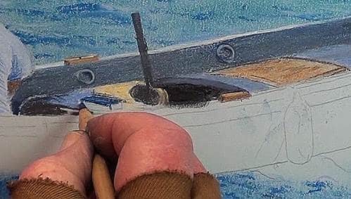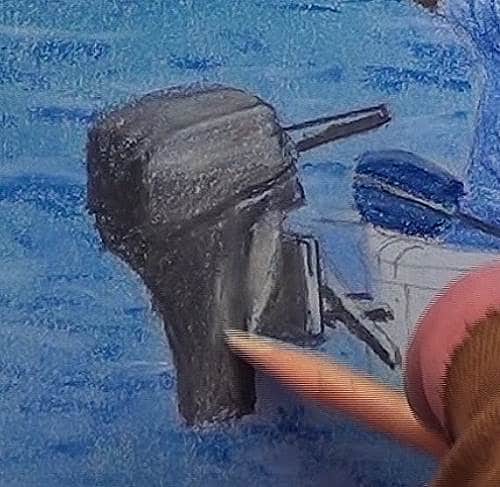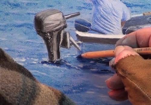 With soft White pastel stick add the splashing of the water and water movement around the boat. Finish painting the fishing rod and touch up the reflections on the water.