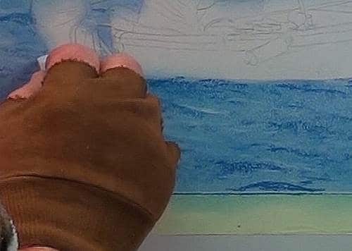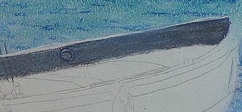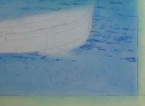 Begin indicating the shadows of the water ripples – it must get more detailed closer to the boat. Look at the reference photograph for help. Now, with a very light Blue pastel stick add the reflections to the top of the ripples.