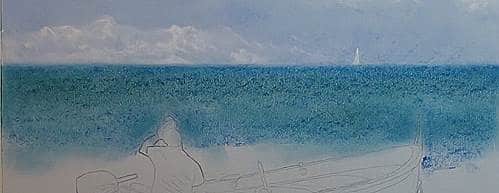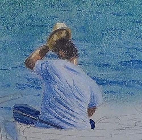Block in the sea with a darkish Blue and add a touch of Green and blend. With a dark pencil, strengthen up the outlines of the figure and boat so as not to be lost in the blending action. Add the small white triangle for a yacht. This help to show depth in the painting.