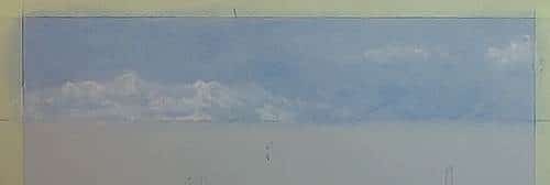 Block in the sky with soft Blue pastel and smooth with the finger. Add the clouds in with soft White. Don't overdo the clouds. Keep them in the distance.