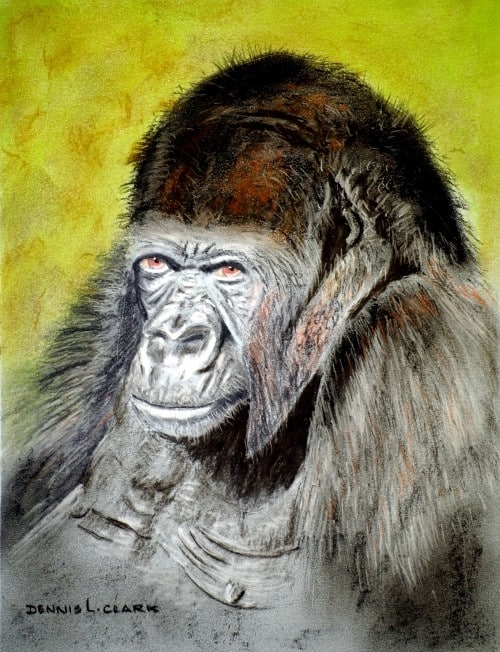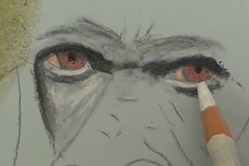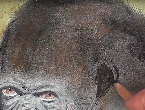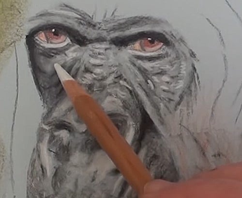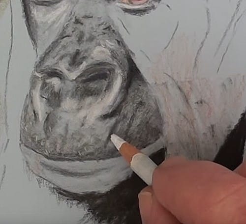 Work on the cheeks and around the eyes and do some blending. Don't over-blend as we need to show the rough character of the gorilla. Again, the White pencil is used for the highlights. Do some more touching up.