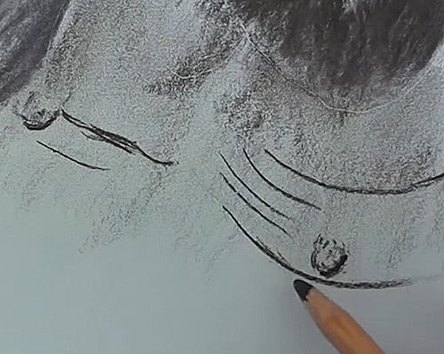 There is very little hair in the chest area so shading and blending only is used for the tonal ranges. Sketch in the nipples and the wrinkles. The dark lines for the deep shadows and the lighter lines for the rounding. Rough in the tonal ranges in between the wrinkles and blend slightly.