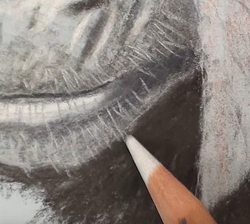We can now begin to add more detail and shading to the nose and mouth area. As you blend, leave out the highlight areas which will be done with a White pencil. The light Grey pastel paper reflects this very nicely. Use a soft White pencil for this. There are lots of highlights around the top of the nose.