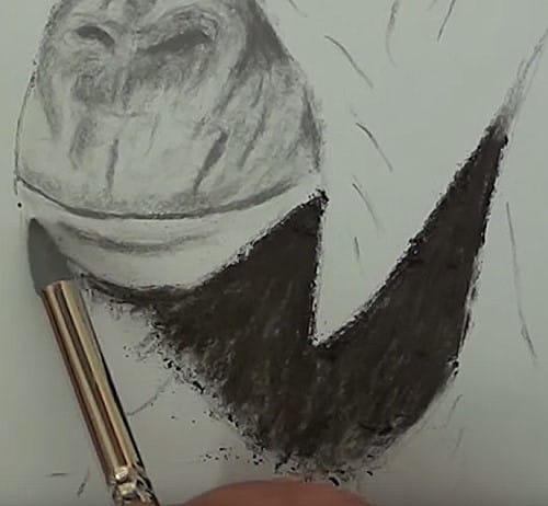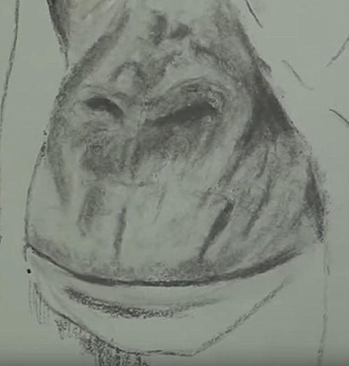 Add the shadow of the chin with a black pencil, keeping any line work in the direction of the hairs. When you have plotted it out, darken up the deepest areas of the shadow. Blend it and use the overflow dust to shade in the lighter areas.