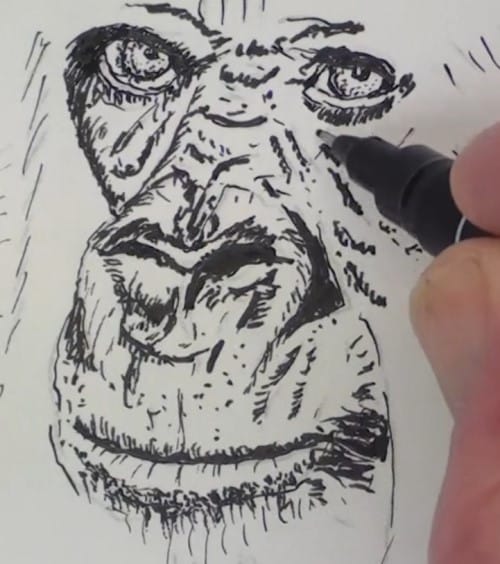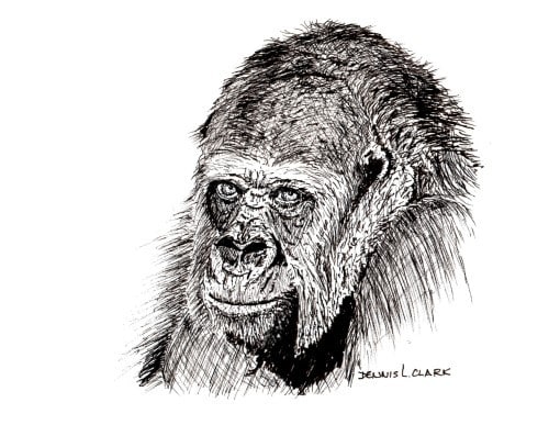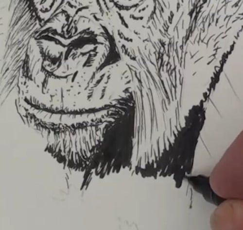 The Gorilla has a hairy chin and we need to show this. Darken up the shadow under the chin and carefully show the light colored hairs of the goatee. Darken up the other deep shadow. You will notice that I do minor touch-ups every so often.