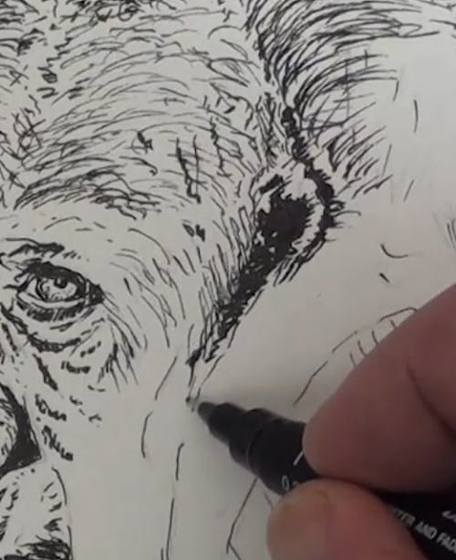 Use the fine pen to lightly cross hatch over the top of the head. Carefully note where the light and dark areas are. Don't overdo it though. Continue to build up the tonal ranges over the whole head and the face area, finishing off around the mouth area. Being a bit of a perfectionist I have decided to add a few more lines in the face area.