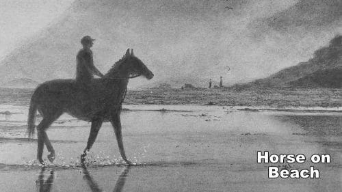 Capture the calm beauty of a quiet beach ride in this beginner-friendly graphite drawing class. “Draw a Horse Walking on the Beach in Pencil” is a step-by-step lesson that teaches you how to draw an atmospheric coastal scene featuring a horse and rider silhouetted against soft mist, distant mountains, and reflective water.