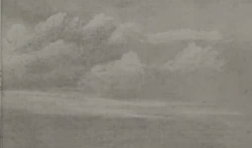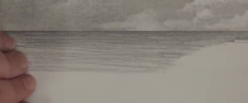Fill in the sky with an even tonal value. Don't worry about the clouds, they will come later, we are just trying to hide the white of the paper. Next add in the clouds. In this drawing I have used the clouds from another photo to make the sky more interesting. If you do the same, just make sure that the sun is coming from the correct direction in both photos. Clouds higher in the sky must be larger as they are closer to you. The closer you get to the horizon, the small the clouds must be.
