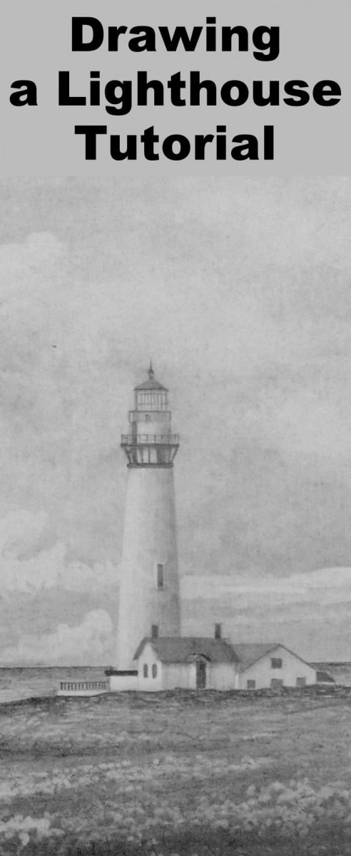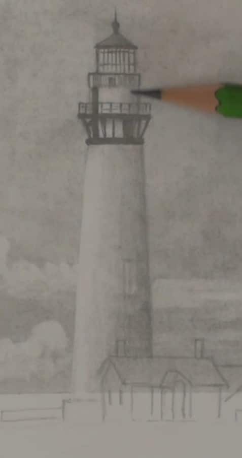 Draw the buildings and the lighthouse as accurately as you can too making sure you get the symmetry of the lighthouse correct. I have used my artist license to leave out some of the buildings.