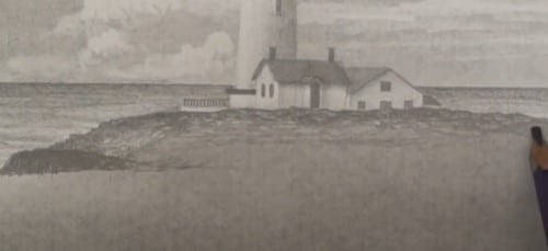 The lighthouse is at the back so draw that in first. Make sure you get a good contrast between the highlight and shadow side of the tower. With the lighthouse itself complete you can now move on to the houses. Don't try to add too much detail into the houses, do ensure you get their perspective correct. To stop the buildings looking flat, add enough contrast between the sunlit walls and the walls in shadow.