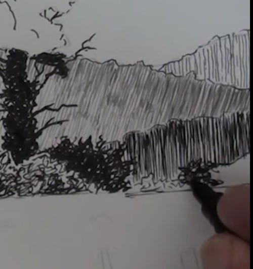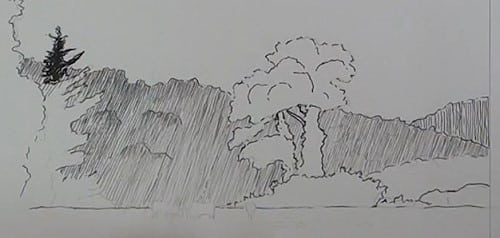 Keep the lines very light behind this tree. Draw these lines very thin and slightly more apart than before to keep the light misty effect here. We want the hills to gradually get lighter towards the right-hand side. I was a bit too enthusiastic and added in more lines than I should have and lost the effect I wanted to show here.