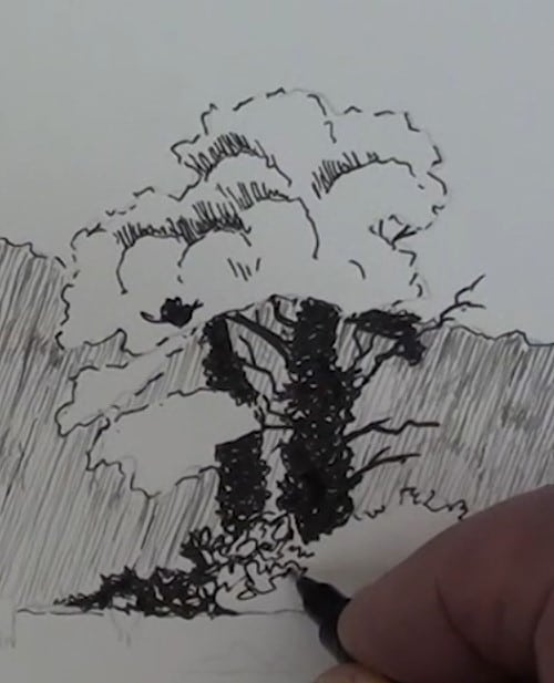 Scribble in all the vegetation of the mound leaving some of the white of the paper to show up as sunlit leaves. Notice where the deep shadows are.