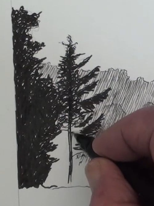 Lightly scribble in the leaves with the 0.3mm pen. Leave the tops of the boughs slightly lighter than the rest of the leaves. Also leave some sky holes. These will show up in nature as the scene is backlit. Continue to work downwards until the lower boughs are also filled in.
