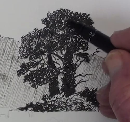 The tree is in silhouette so we can go to a thicker nib. I've opted for a 0.3mm felt-tipped pen. Any make of pen will do. Fill in all the shadow areas first. Vines have wrapped themselves around the trunks. Scribble them in to show the visible texture. Add in all the bare branches.