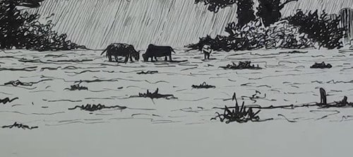 These two dark stumps balance out against the other cows. Add some small shrubs and these horizontal lines to show the flatness of the foreground. These lines are much closer together towards the distance. Continue to add more lines and shrubs which are drawn larger in the foreground. Notice the one pen for the darks and the other pen for the thinner lines. Add some grasses for effect.