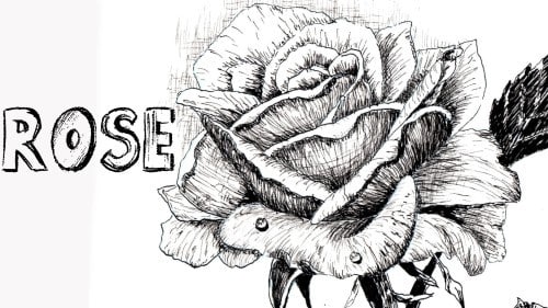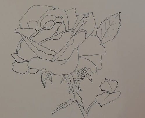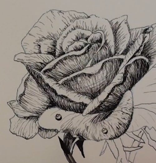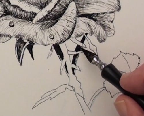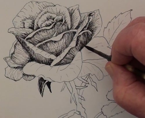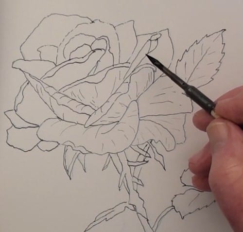 Begin the outlining of the rose and petals. Do this with the thinnest nib possible as we don't want a thick line spoiling the final drawing. Here a mapping pen nib is being used.