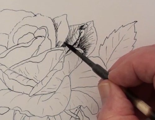 For the petals facing directly towards the light source (top left) only a few thin lines are needed to show up the petals. Add a few discreet cross-hatchings in the very dark areas. Remember to periodically clean the dried or semi-dried ink off the nib.