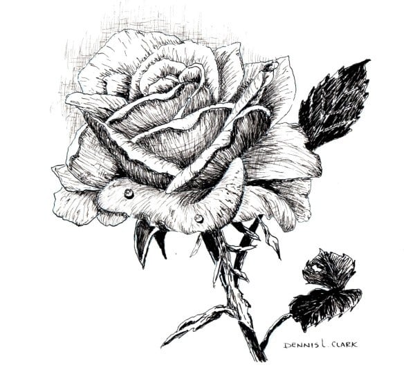 The rose petals are almost finished. Be careful in not filling in too much into the highlight areas. There has to be a good balance between light and dark areas. Notice in the middle petal there are a few horizontal curved lines that add to the impression of the petal rounding.