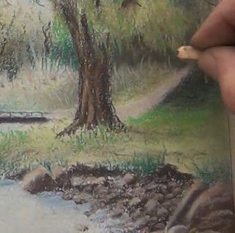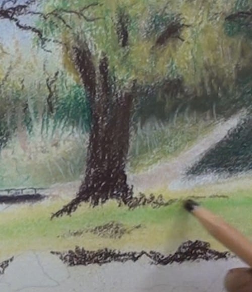 Lightly add a light green to the grass embankments and with the dark brown pencil, merge the trunk into the grass.