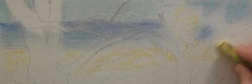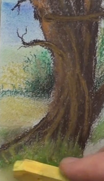 Merge the grass and the trunk of the main tree. With a yellow pastel stick stroke in the highlights and the texture of the trunks.