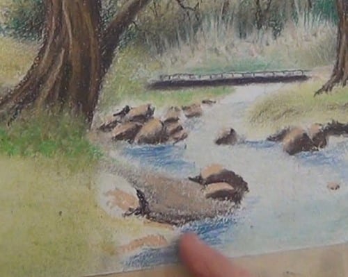 With a white pencil, softly blend the dark blue into the very light blue stream.