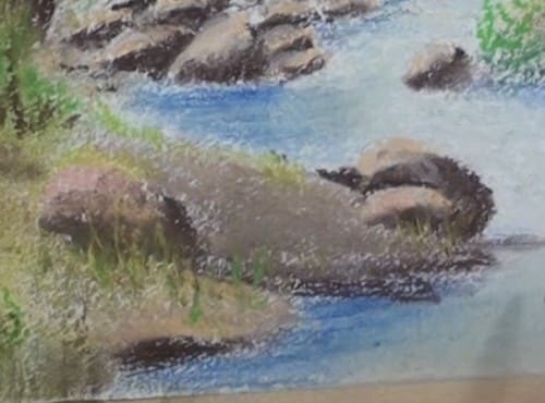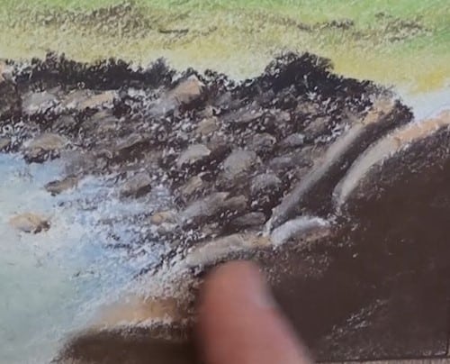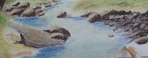 With a pinkish coloured pencil block in the highlights of the small rocks. When you have done that, add the shadow or darks of the rocks.