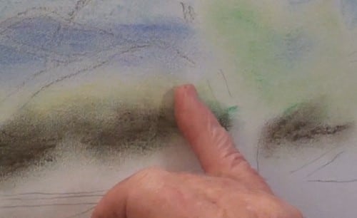 There are no details in these trees. First layer a very light yellow and then a very light layer of green. Smooth it with the finger. Next add some dark brown over the lower section for the shade under the trees.