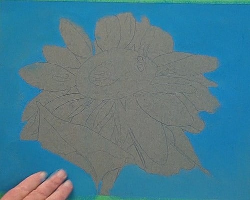 Cover the entire background with a Blue pastel stick by first carefully working around the entire edge of the subject. It is then easier to complete the whole background. Smooth out the background color. Do so lightly over the edges of the drawing so that the outline is still visible.