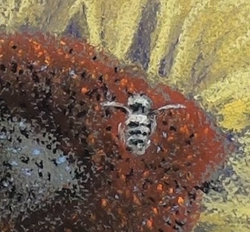 A Black and a White pastel pencil is used to paint the bee. Don't try to add too much detail to the bee.