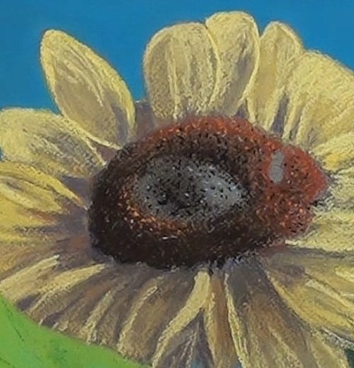 As you progress add in the shadows between the petals at the base of the central portion or crown with a darker pastel. Don't rush with the petals. Take your time because if you move too fast it is easy to get lost between the multitude of petals. Be sure to keep the separation between each of the petals, especially those that overlap.