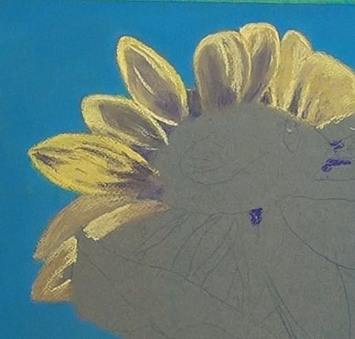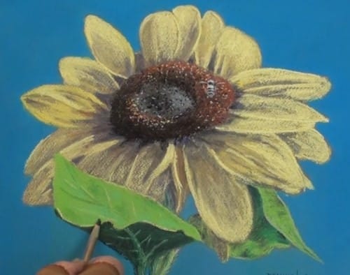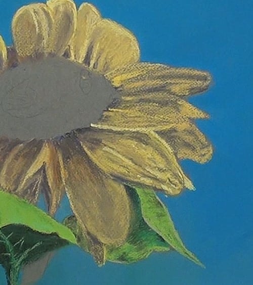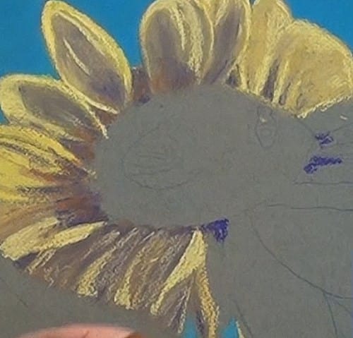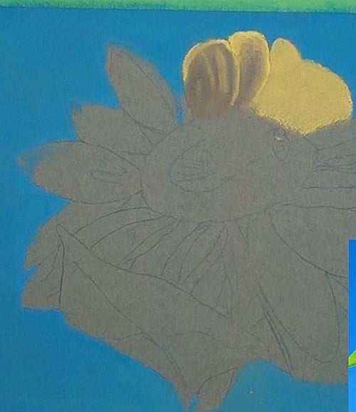Start at the top petal, using a bright yellow pastel stick. Where possible, it is easier to paint petal for petal – at least with the major tonal ranges. Detail will come much later. Because the paper is a dark gray it is relatively easy to smudge in the shadow areas. Use a Yellow Ochre for the shadows if you are painting on a very light or white paper.