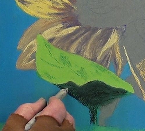 Use the same color to paint this other leaf, except that it is much easier to use a very dark pastel pencil for the shadows. Only the top corner has the darkest value.