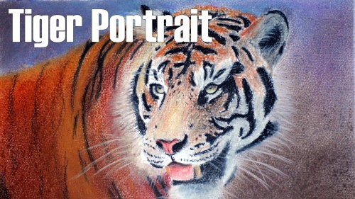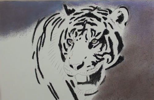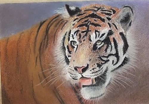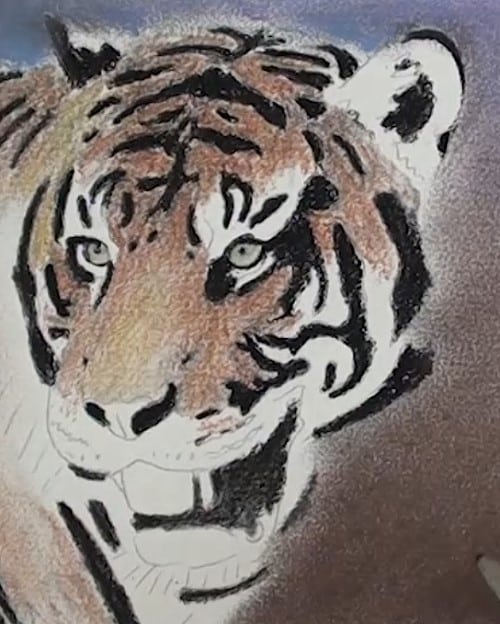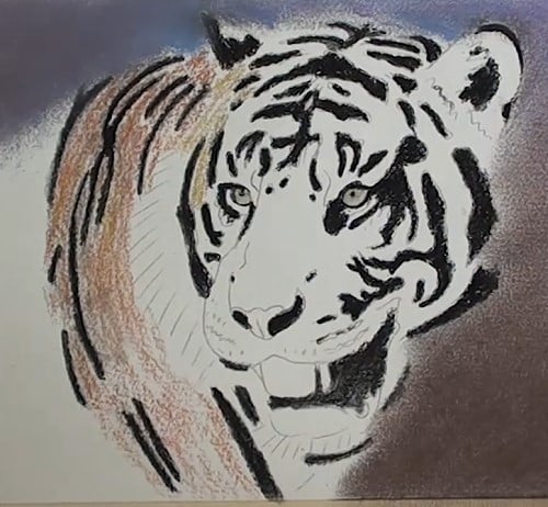 Lightly stroke a blue-grey pastel stick in the background area. Blend with the finger and add some black and blend further, keeping it a bit darker below. Use the stump to blend it nicely against the edge of the tiger.