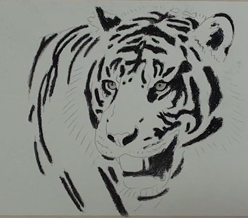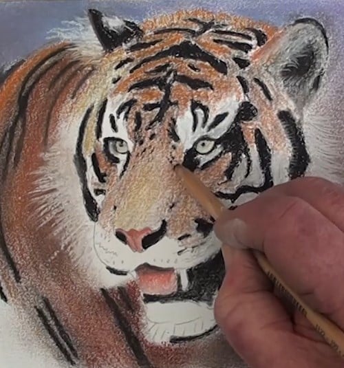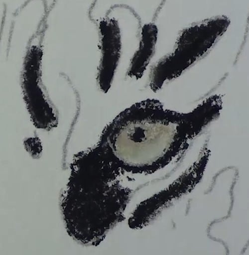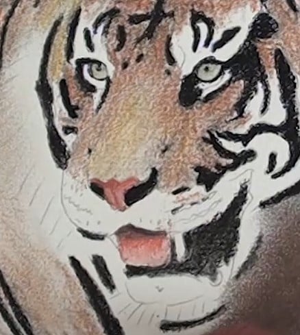 Begin, using a black pencil, to add in all the black lines and patches. Don't do any blending at this stage. As we progress around the head, the tiger template starts to look like a tiger.