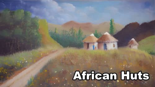 Add the small area of grasses in the distance. With a yellow such as Naples yellow, block in the sunlit area near the huts. The foreground is in shade from nearby trees that are out of sight. Stroke in a layer of light green and then overlay it with brown. Then blend.