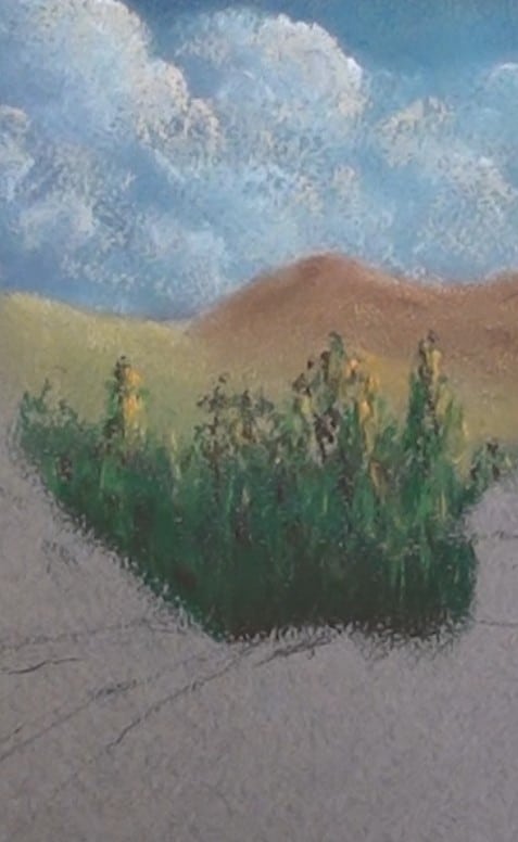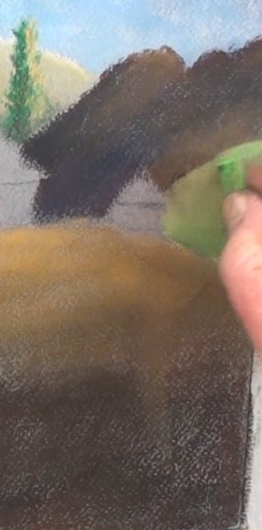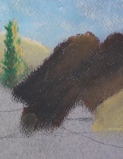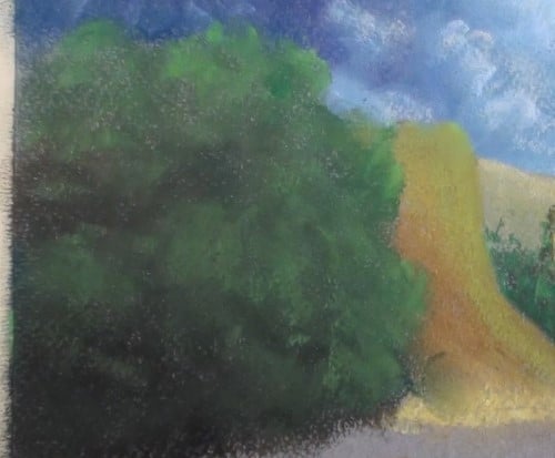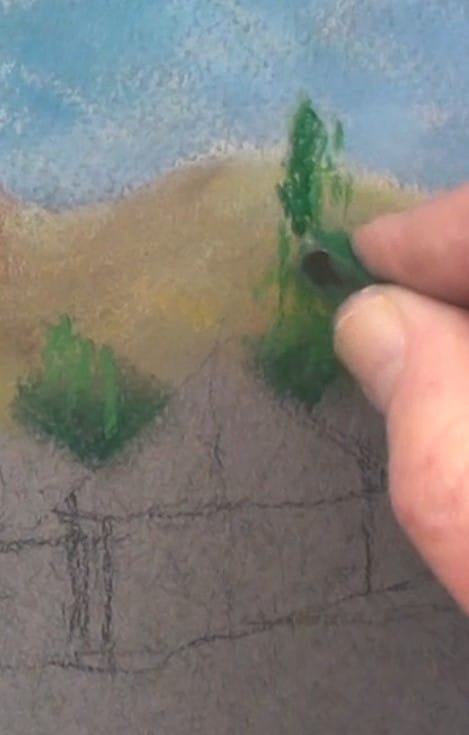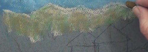 Block in the tree mass with dark green and darken the lower end with dark brown. With a light green pastel stick start to form the sun on some of the trees. Then blend in as shown. We are still only painting shapes and masses.