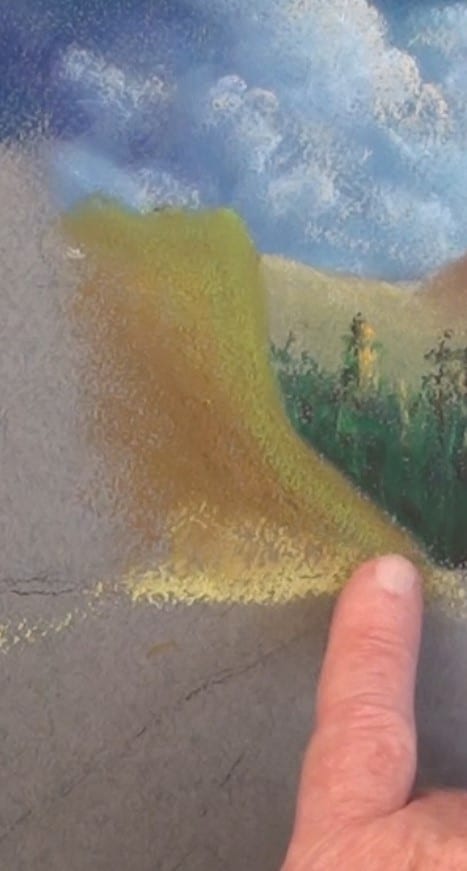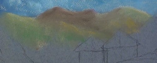 Add a light green along the profile. Be careful to make the top higher than the distant hills otherwise it will look as if it is part of those hills. With a light brown add a light layer to the side and gently blend as shown. Add some light yellow to the foot of the hill.