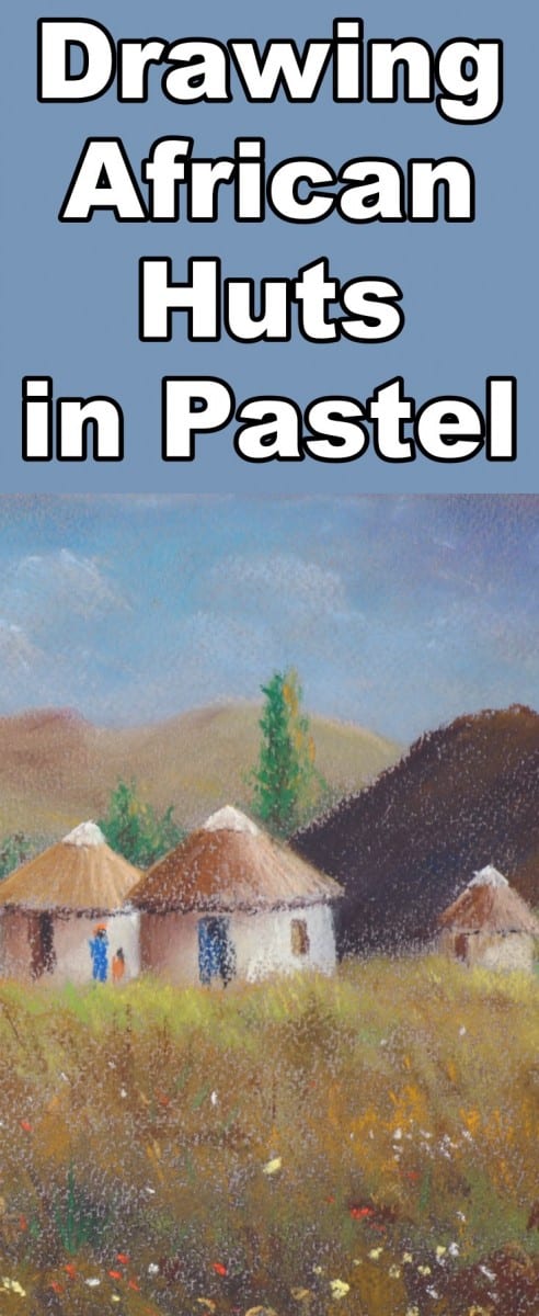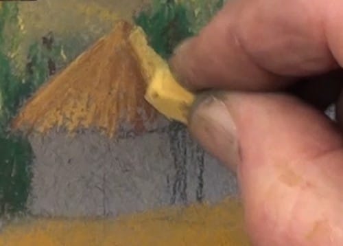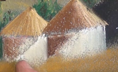Outline the roofs with yellow and then add the shadow area with a raw sienna colour. Then lightly work a yellow over the top in line with the thatching. Don't blend, keep it rough.