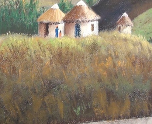 With some yellow, and with vertical movements add the distant grass up against the lower section of the huts. With a light green do the same but a bit lower down. Fill in the foreground with random strokes of brown, dark green, light green, yellow ochre as shown. Dot in some white, yellow and orange for some flowers.