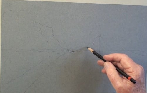 In this lesson use a charcoal stick or pencil to draw the main lines needed to guide your pastels. With charcoal it is very easy to rectify any mistakes.
