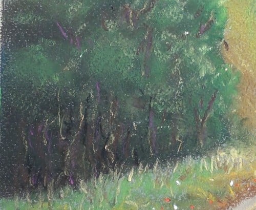 Block in a patch of dark green. This is the underpainting. We are painting a plantation instead of individual trees. With a dark brown darken up the lower parts to add contrast. The lighter colours we will later add next to it. Then with a light green pastel stick just stroke in a few lines to start the impression of trees in sunlight.