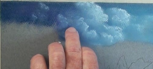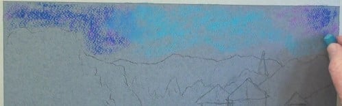 Loosely stroke in some mauve to the sides and light blue in the centre and blend in with the finger.