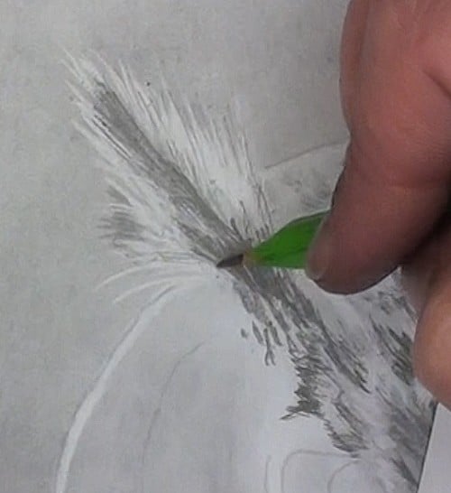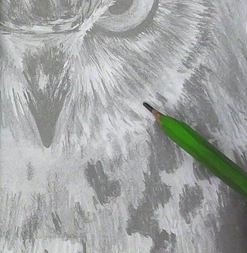 Then lift out the lighter feathers using your pen shaped eraser. Using a flicking or chopping motion.
