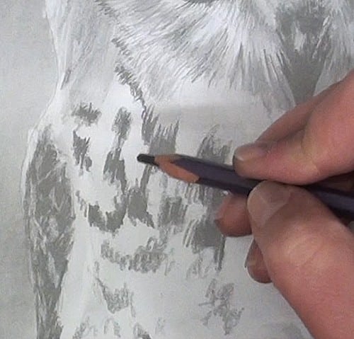 To do this start by scribbling in the dark markings on the feathers. Don't try to get it perfect remember each owl is unique.