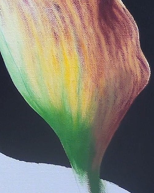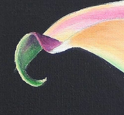 Add the shadowing along the right underside of the flower and the top left corner. Then paint the tip on the top left. Carefully follow Nolan's instruction to create the looking-in-and-under effect in this spot.