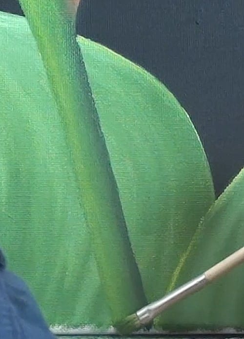 Remove the masking tape from the stem. Mix a contrasting color to help the stem stand out from the leaves. Paint the tones down the stem, then blend them. Watch as Nolan “completes the rounding” to finish the stem.