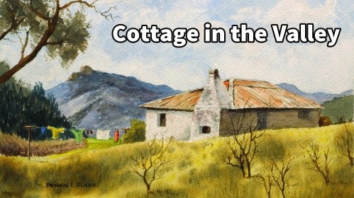 These leaf clumps are dabbed in with a sponge. Leave some sky holes, as well as the dry branch. Notice that this branch is subtly pointing the viewers eye towards the cottage.