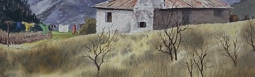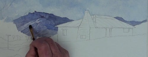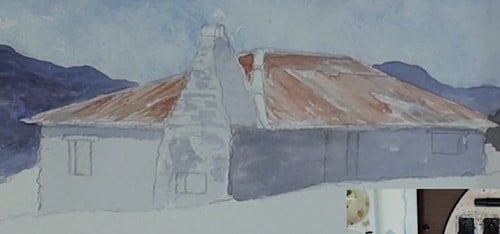 The roof begins with a darker mix of Sienna as this indicates the rust on the roof sheets. Gradually build up the rust colour as you paint along.