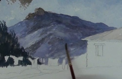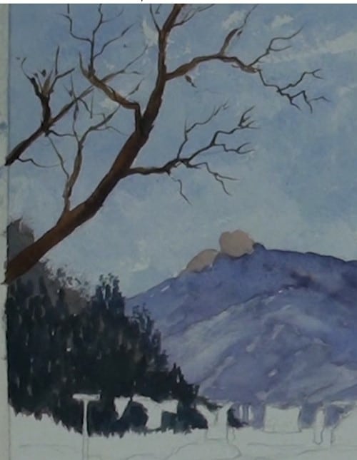 This is a dark mix of Ultramarine Blue and Alizarin Crimson or Cadmium Red. The closer hill is slightly darker on the shadow side of the hill. Lift out the highlights with a tissue. Don't paint the rocks yet that are on the summit.