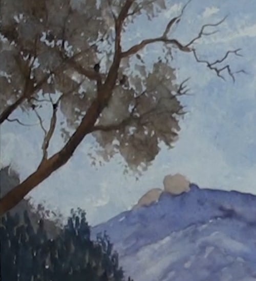 The colour for these trees is a mix of Viridian and Burnt Sienna. The tree clump on the left is closer, so indicate some loose leaves against the skyline. A touch of Sienna plots the rocks on the summit.